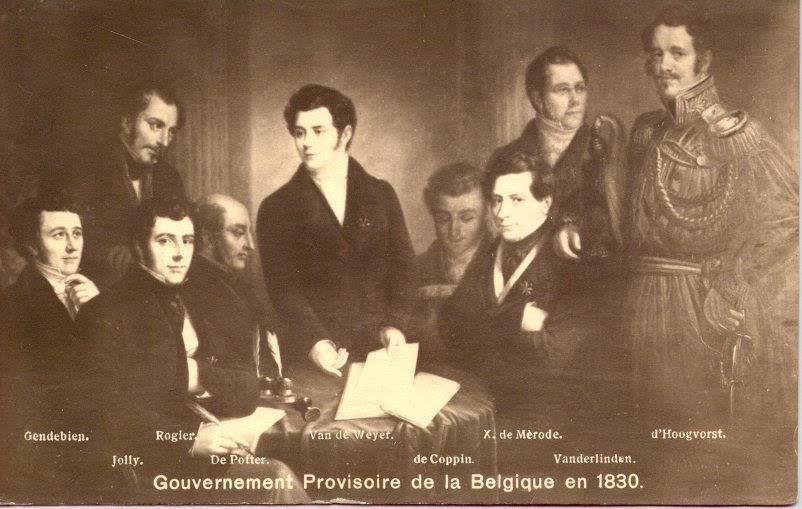 Het Voorlopig Bewind van België: v.l.n.r. Gendebien, Jolly, Rogier, De Potter, Van de Weyer, de Coppin, de Mérode, Van der Linden, van der Linden d'Hooghvorst.