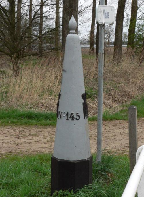 Delà, la limite tournant à l'Est, suit le milieu du ruisseau précité, jusqu'au pont dans le chemin de Neeritter à Stamproy, pont qui appartient aux Pays-Bas, et près duquel une borne (n0. 145) sera plantée. Ce point est en même temps celui de contact des communes de Neeritter et Hunsel (Pays-Bas) et du territoire de Beersel Kessenich (Belgique).[1]